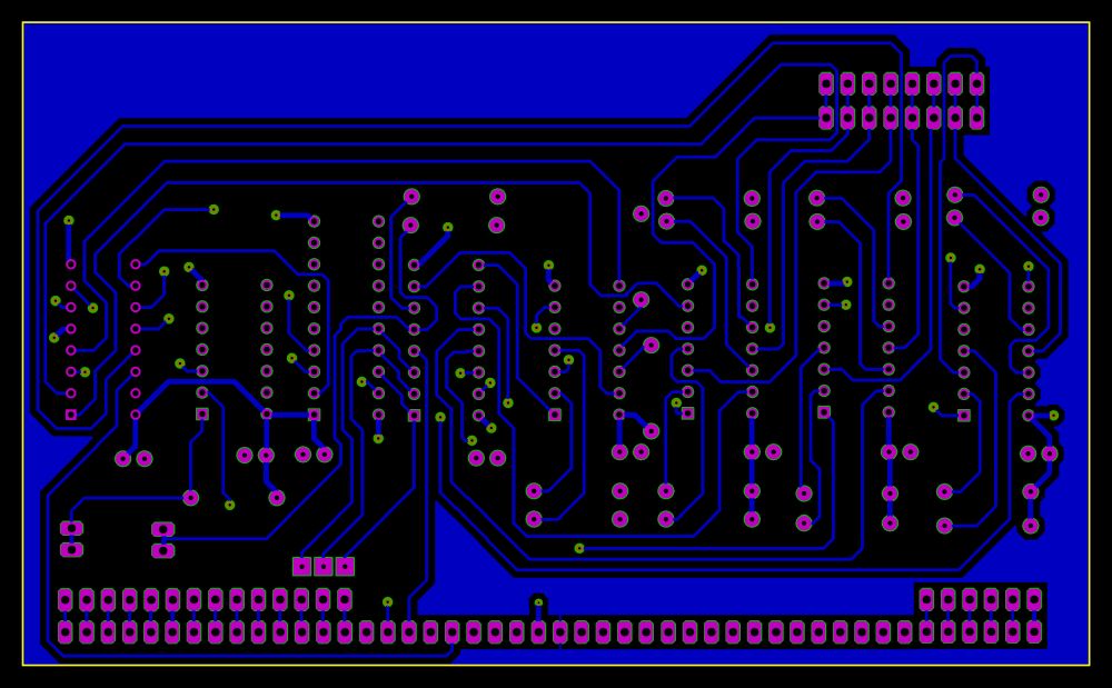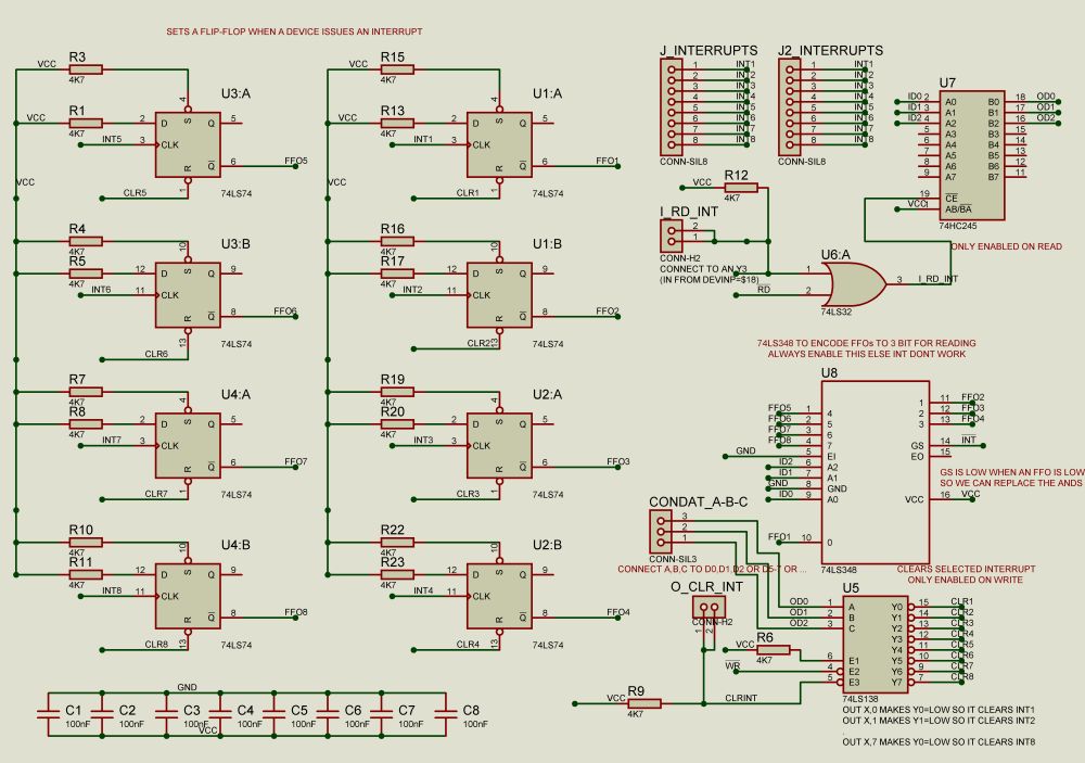 The Module supports 8 devices. The jumper cable on RD_INT connects to Spare3 and that connects to the device select module so i can use an in command to communicate with this module. The jumper cable on CLR is connected to Extension 6 and that connects to the device select so i can use an out command to clear an interrupt. D0,D1,D2 are used to select 1-8 interrupts either to read or to clear. Other datapins can be used for reading other devices with the same port (Spare3). I am using D6 and D7 with the usb keyboard. Also you can use the same port for read and write, and different data pins to control the flip-flops.