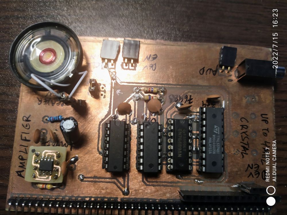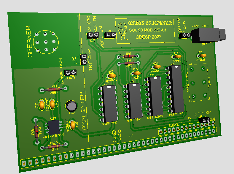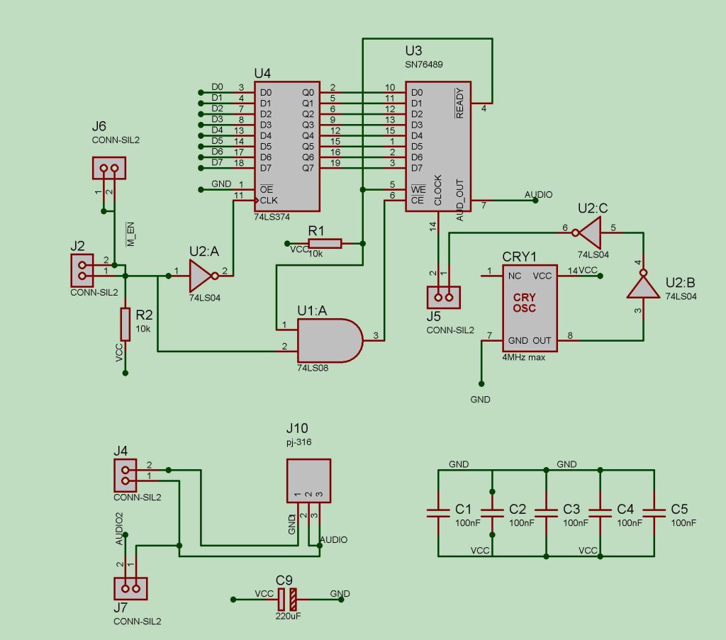 This is my sound module, it supports 3 channels plus 1 noise channel. The main I.C. is the SN76489 which was used by many home computers and game consoles in the 80s. There is also an integrated amplifier to support a speaker on this module and if you want to make use of this you should put a jumper on J4. The Crystal Oscilator should not exceed 4MHz, i am using 2.5MHz derived from the main Oscilator so i haven’t populated this just connected the input signal on J5.