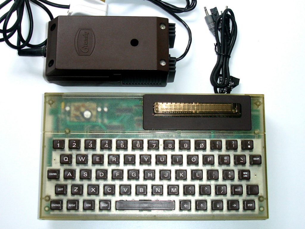This model features a transparent case, probably used before the cream-coloured one was decided upon, and rear ports which differ from those of a normal Newbrain and show no port to output to screen.